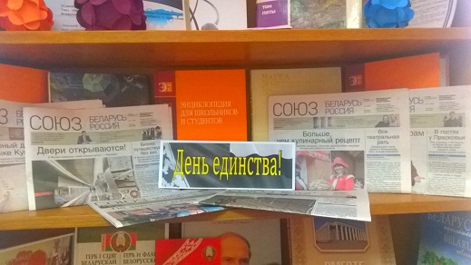 В День единения народов Беларуси и России в городской библиотеке № 2 был проведён тематический урок «День единения народов Беларуси и России». О том пути, который прошло Союзное государство за эти годы, рассказала присутствующим библиотекарь и познакомила учащихся с книгами и публикациями в периодической печати данной тематики, которые были представлены на книжной выставке «Россия и Беларусь – мы вместе». В ходе мероприятия звучали песни «Молодость моя» и «Беловежская пуща».