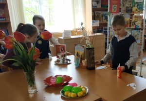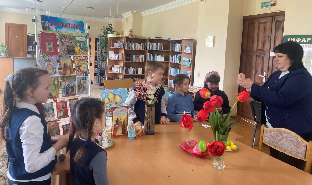 В преддверии светлого праздника Пасхи в читальном зале городской библиотеки №2 для юных читателей прошел час православия «Светлый праздник Пасхи». Участники мероприятия познакомились с историей православного праздника, народными поверьями, с пасхальными традициями и играми. С удовольствием отвечали на вопросы православной викторины, приняли участие в мастер-классе «Пасхальный сувенир». На пасхальной экспозиции были представлены основные атрибуты Пасхи: веточки вербы, крашеные яйца, пасхальные украшения, а яркая иллюстрированная книжная выставка «Пасхальный перезвон» познакомила ребят с литературой, которая приобщает детей к культурному и духовному наследию человечества. Праздник оставил у ребят приятное и радостное настроение.