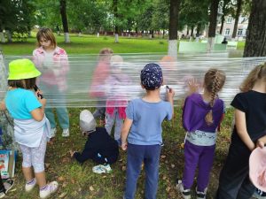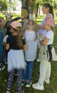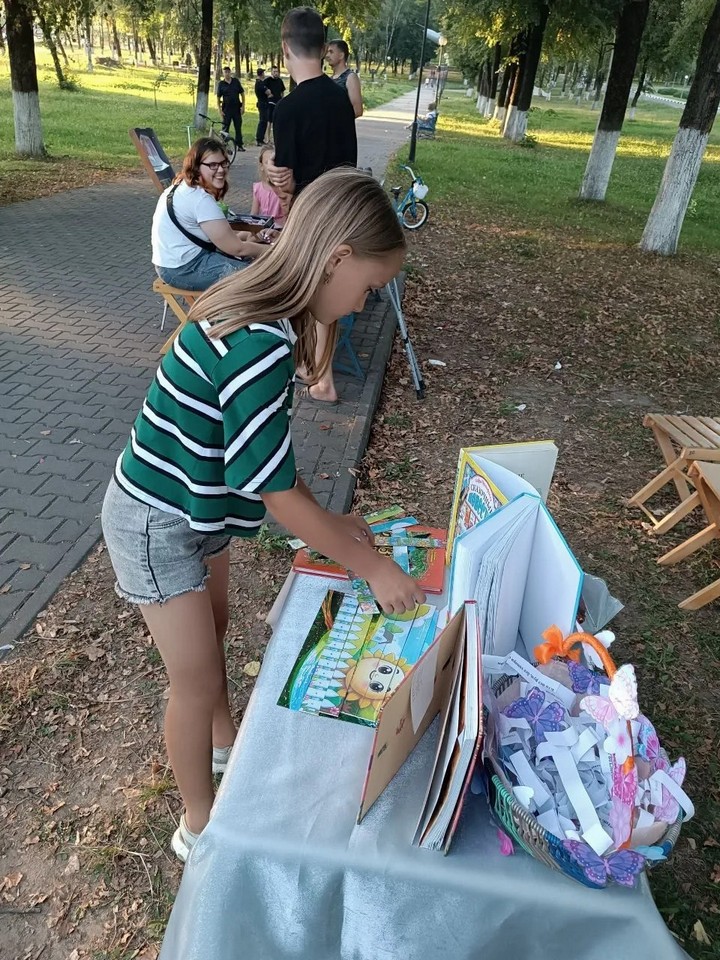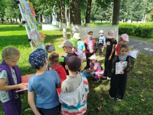 Сотрудники городской библиотеки №2 для ребят из школьного лагеря ГУО «Средняя школа №5 г. Кричева» подготовили час игры «У книг нет каникул». Библиотекарь предложила ребятам отправиться в путешествие по Лету на паровозике из Ромашково. Но, чтобы сесть в поезд, надо было купить билеты. Билеты – отгадки к загадкам. Отгадав летние загадки, ребята с весёлым настроением двинулись к станциям: «Обнимашкино», «Читайкино», «Приключенческая», «Станция Цветных Мелков».