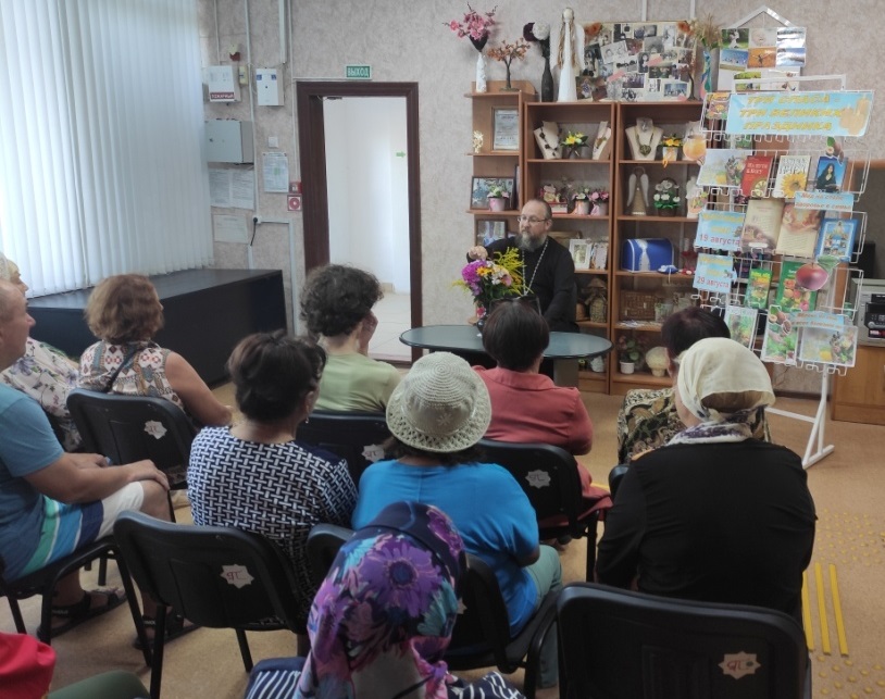 «Праздник трёх великих Спасов» – под таким названием сотрудник городской библиотеки №1 на базе РЦСОН для людей пожилого возраста провела тематическую встречу совместно с настоятелем храма Воскресения Христова протоиереем Сергием Коростелёвым. Гости мероприятия узнали об истории трёх праздников, почему они так названы, какие ещё православные праздники отмечаются в августе, о значимости Успенского поста и церковных таинств. В тёплой атмосфере отец Сергий отвечал на многие вопросы присутствующих, пожелал всем Божией помощи в добрых делах. Завершились тематическая встреча обзором у книжной выставки «Три Спаса – три великих праздника».