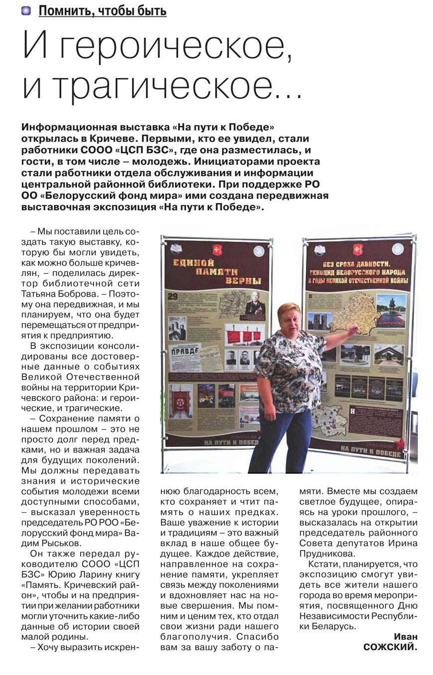 ■ Информационная выставка «На пути к Победе» открылась в Кричеве. Первыми кто ее увидел стали работники СООО «ЦСП БЗС», где она разместилась, и гости, в том числе – молодежь. — Текст : электронный // Telegram-канал «Кричев новости» : сайт. — URL: https://t.me/krichevsmi/56704 . — Дата публикации: 5.06.2025.