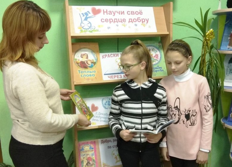 Ведущая рассказала учащимся об истории возникновения Дня инвалидов, о проблемах, с которыми сталкиваются люди с ограниченными возможностями. В ходе мероприятия ребята рассуждали о доброте, милосердии и сострадании. Вместе с ведущей объясняли такие высказывания, как «Давайте сглаживать углы», «Не оценивайте людей, а цените их». Дети с удовольствием вспомнили сказку Валентина Катаева «Цветик-семицветик», которая учит нас доброте и милосердию. Закончился библиочас обзором литературы у книжной выставки «Научи своё сердцу добру», где были представлены книги, в которых поднимаются нравственные темы доброты, милосердия, сострадания.