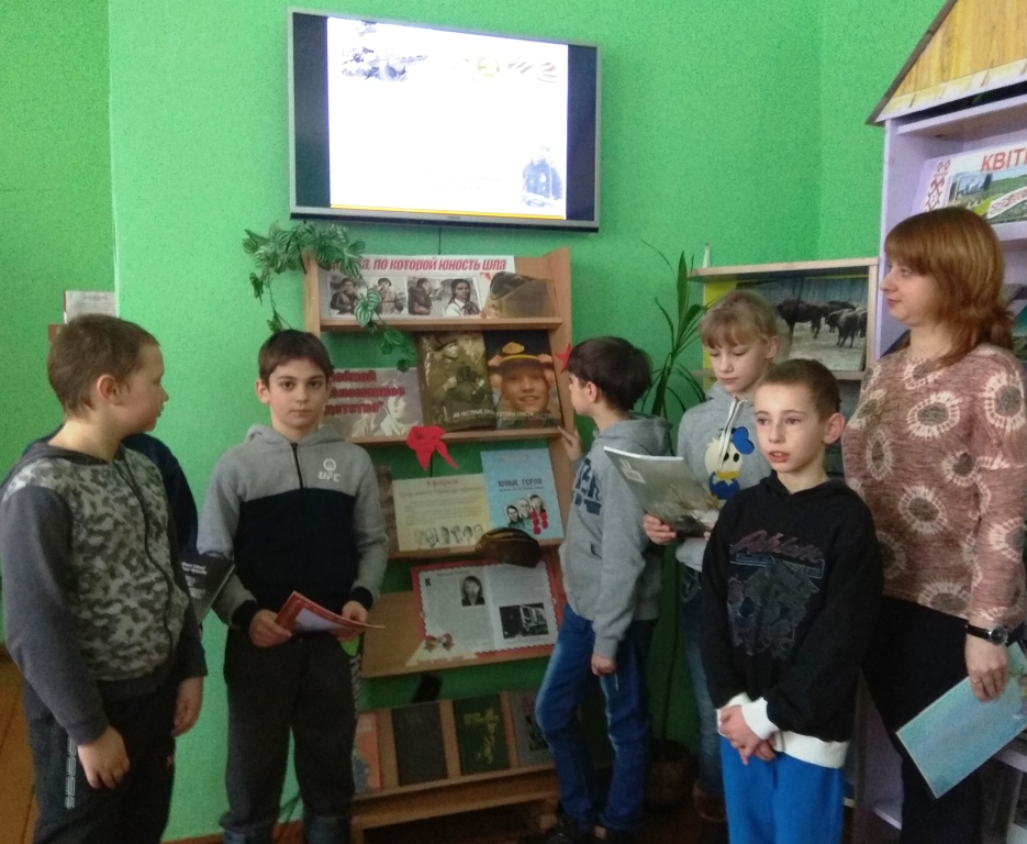 Библиотекарь рассказала присутствующим о том, что 8 февраля – это День памяти юных мальчиков и девочек всех стран, тех, кто боролся и умирал за свободу, равенство и счастье людей. Из медиа-обзора, школьники узнали имена и фамилии своих ровесников, погибших на полях сражений, замученных в оккупации. Вниманию ребят был предложен документальный фильм «Дети — Герои Великой Отечественной Войны» о подвигах юных героях-антифашистах. В завершении урока мужества прошел обзор у литературной выставки «Дорога, по которой юность шла».