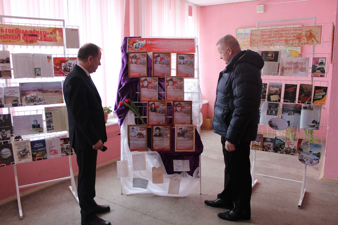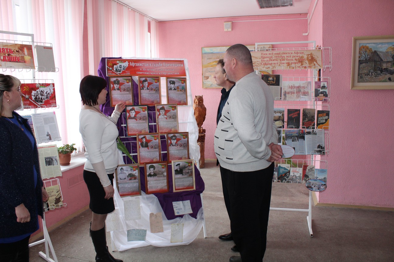 Ведущая рассказала гостям о мужестве, стойкости и героизме наших солдат, принимавших участие в военных событиях в Афганистане, познакомила с тематической выставкой «Боль души — Афганистан». На мероприятие были приглашены воины-интернационалисты: Карпалов Геннадий, Павлюченко Владимир, Симага Борис.