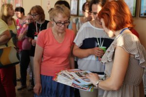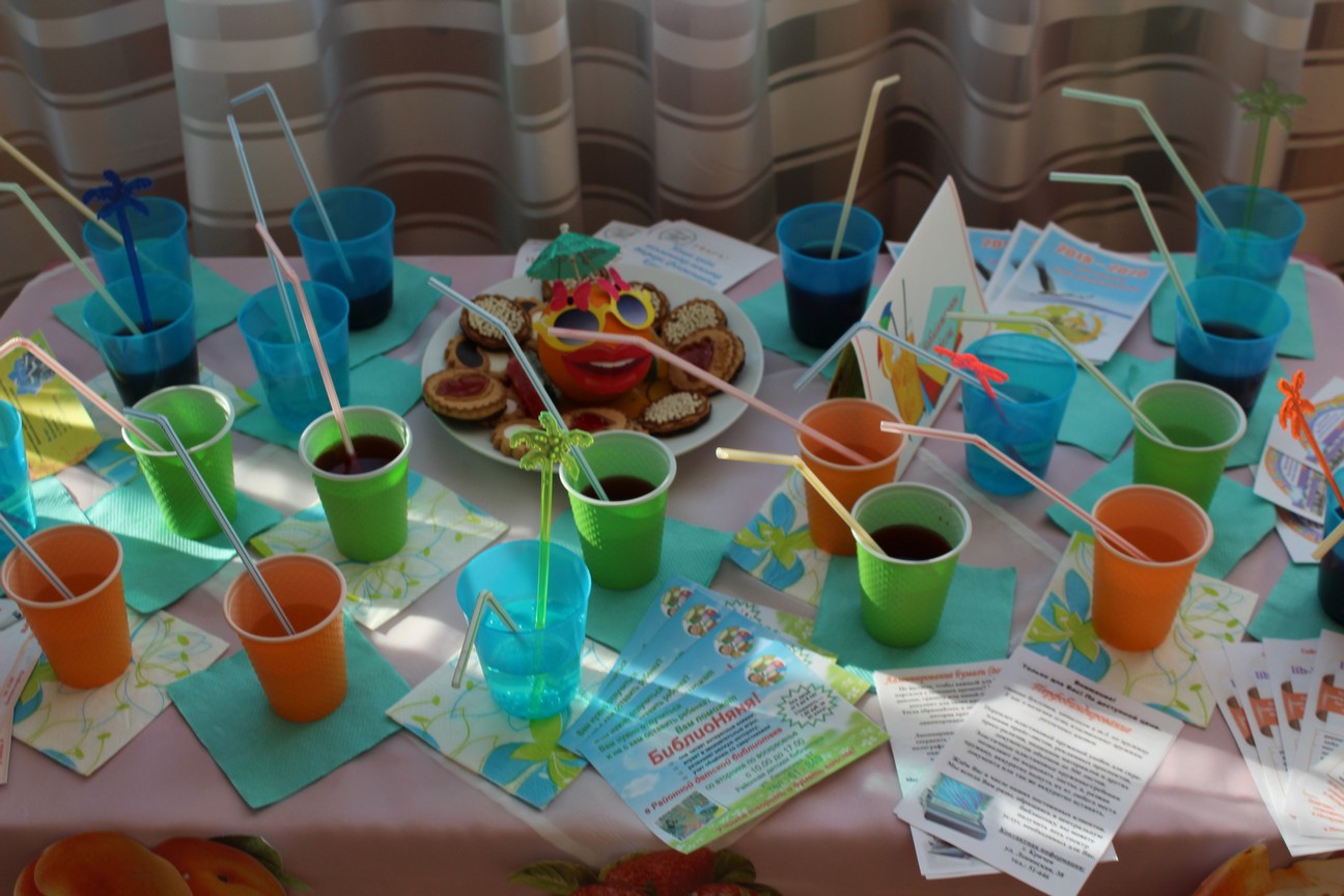 Затем семинар продолжился в районной детской библиотеке. В день мероприятия место перед библиотекой превратилось в библиокафе «Літаратурныя сустрэчы»: накрытые скатертью столы, необычное «литературное меню», «салфетки» с цитатами из книг…. Ассортимент литературного кафе был очень разнообразен: можно было продегустировать библио-апперитив «Клубнічны мікс», «Паэтычнае асарці» (вершы пісьменнікаў-землякоў), «Мясцовыя прысмакі» (кнігі пісьменнікаў-землякоў), кніжны фуршэт «Смачна есці! Цікава слухаць!» (аўдыё і электронныя выданні) и многое другое. А на десерт можно было отведать «Зефір у шакаладзе» (романы о любви), «Дэтэктыўны мікс» (детективная литература), суфле «Фантастычнае» (фанстастика). В заключение семинара гости познакомились с организацией пространства для детей в библиотеке, наглядными формами работы с детьми, рекламной деятельностью районной детской библиотеки.