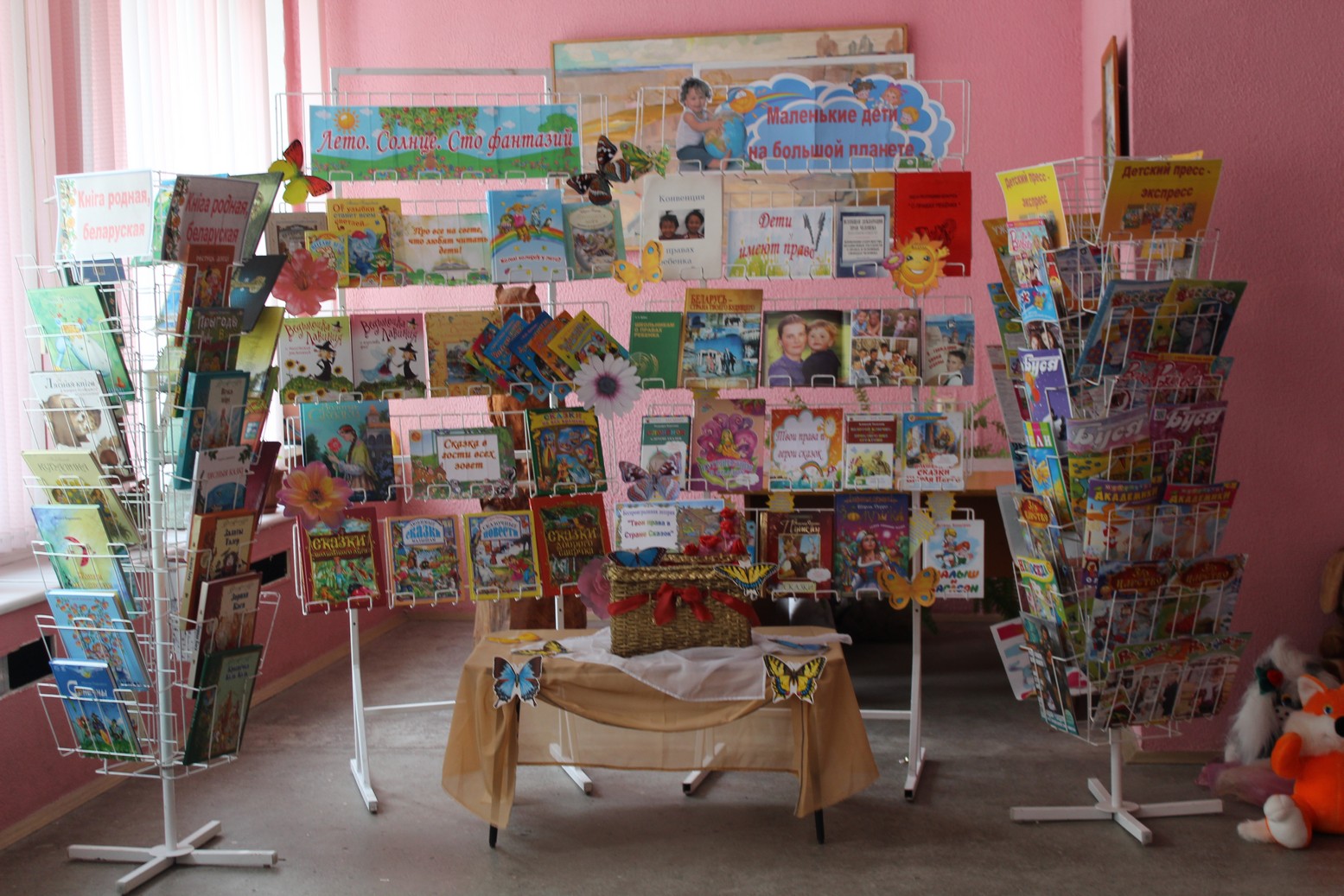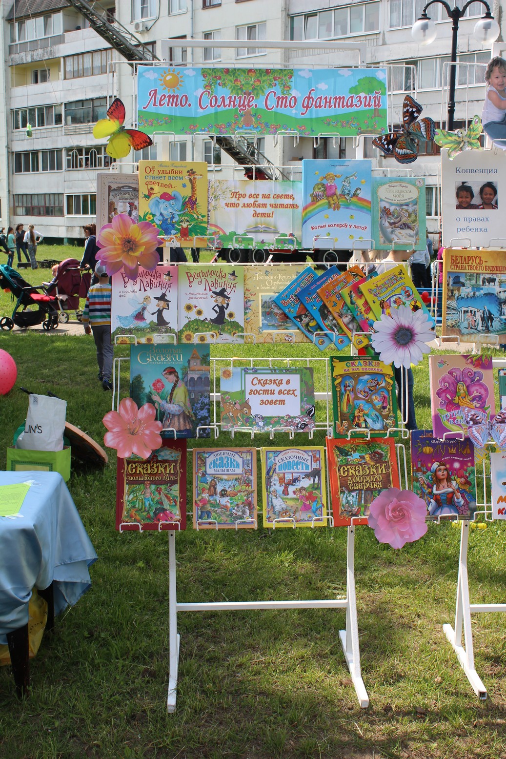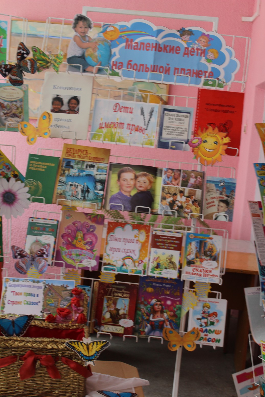 На литературной выставке «Маленькие дети на большой планете» был представлен материал о защите прав ребёнка, законодательные акты, направленные на создание благоприятных условий для жизни и развития детей, защиты их прав и законных интересов. Заинтересовала ребят литературная выставка-обзор «Лето. Солнце. Сто фантазий», которая содержала интересные новинки художественных произведений о мире и дружбе, сказки для самых маленьких. Помимо программной литературы, юные читатели могли познакомиться с юбилейной выставкой «Детские писатели-юбиляры 2019 года». Литературная выставка «Детский пресс-экспресс» знакомила ребят всех возрастов с детскими журналами, а на выставке-вертушке «Кніга родная, беларуская!» представлены книги на родном белорусском языке. Гости праздника с удовольствием приняли участие в беспроигрышной лотерее «Твои права в Стране Сказок».