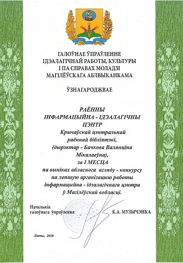 2018 год – I место по итогам областного смотра-конкурса на лучшую организацию работы информационно-идеологического центра в Могилевской области занял Районный информационно-идеологический центр Кричевской центральной библиотеки, (директор – Бачкова Валентина Николаевна).