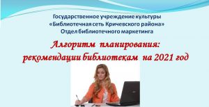 В этом году районный семинар по планированию «Планирование как составная часть работы библиотеки. Приоритеты планирования на 2021 год» был подготовлен в форме онлайн. В рамках семинара в форме медиа-презентаций, видео-обзоров были рассмотрены приоритетные направления деятельности библиотек: обсуждены алгоритм планирования: рекомендации библиотекам на 2021 год, основы делопроизводства в работе публичных библиотек: оформление пояснительных записок и годовых планов и требования к оформлению и подготовке сценариев, книжных выставок, обзоров литературы, формы работы библиотек в онлайн-режиме.Кроме того на семинаре в рамках творческой мастерской районная детская библиотека поделилась коллекцией творческих идей работы с детским читателем в режиме онлайн, а городская библиотека №1 поделилась опытом работы музейной комнаты «Кричевщина литературная». Отделом библиотечного маркетинга была представлена презентация краеведческого календаря ««Крычаўшчына: знамянальныя даты 2021 года. Каляндар знамянальных і памятных дат».