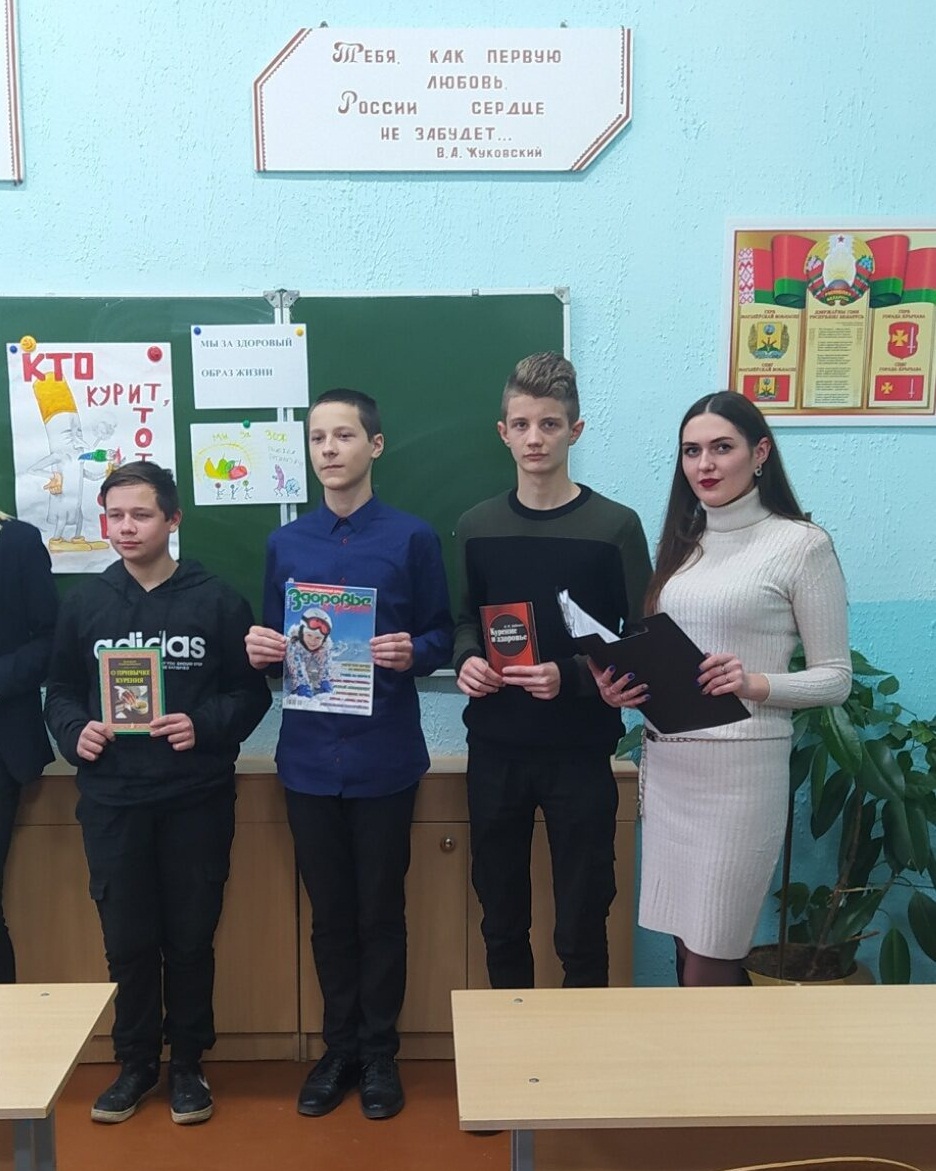 Для учащихся ГУО «Средняя школа №1 г. Кричева» проведена слайд-беседа «Курить не модно – дыши свободно!». В ходе мероприятия разговор пошел об актуальной проблеме — употреблении никотина. Дети и подростки, пытаясь подражать взрослым, рано начинают курить, что негативно сказывается на растущем организме. Ребята высказывали свои мысли о курении, не только простых, но и электронных сигарет, о своём нежелании быть пассивными курильщиками рядом с курящими взрослыми, вспомнили болезни, которые вызывает курение. Ответили на вопросы викторины-теста «Папиросо. Табако. Сигаро. А стоит ли?». Учащиеся узнали много новой информации о вреде курения, что позволит им не приобретать этой вредной привычки.